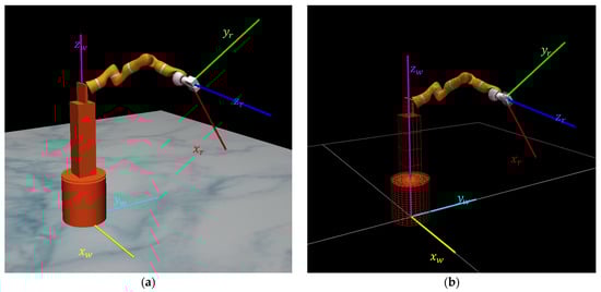 MuJoCo HAPTIX simulation environment for the platform-mounted KUKA LWR robot corresponding to a laboratory setting: (a) solid and (b) grid illustration. The world frame coordinate system is defined with , , and axes, while , , and define moving coordinate system related to the robot EE.