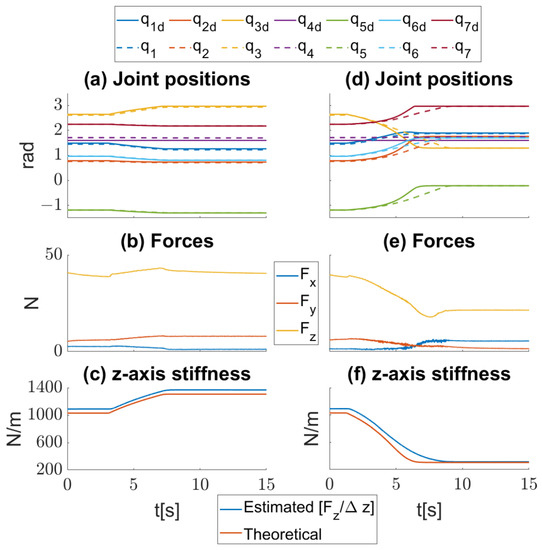 The method was applied in a static experiment that also allowed visual validation. For better illustration, the compliance of the EE along the direction of motion was set to the smallest or largest possible value without losing generality. Since there was only one degree of redundancy, the compliance shaping stopped when one of the joints reached its limit or a local minimum for the norm was reached. The experiment is shown in Figure 3, which illustrates EE contact with a surface. In this experiment, the robot’s EE moved downward toward the sponge, with its endpoint reference 5 cm into the area of the sponge. Then the EE adjusted its stiffness. This was repeated to minimize and maximize the stiffness along the -axis. The effect of adjusting the stiffness on the EE is shown by comparing the two images at the end of the shaping algorithm in Figure 3, and the measurements are shown in Figure 4. The ability to adjust the stiffness is also limited to the pose of the robot. When the robot is positioned at the end of its range, there is less maneuverability than in the middle of the workspace. The results showed that there was a strong correlation between the estimated and expected stiffness of the EE. The estimated stiffness was slightly higher than the theoretical. Nevertheless, these values had a high level of correlation. Videos of the sponge experiments are available as Supplementary Materials.
