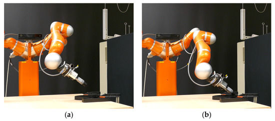- Lukić, B.; Petrič, T.; Žlajpah, L.; Jovanović, K. KUKA LWR Robot Cartesian Stiffness Control Based on Kinematic Redundancy. In Advances in Service and Industrial Robotics. RAAD 2019. Advances in Intelligent Systems and Computing; Springer: Cham Germany, 2019. [Google Scholar] [CrossRef]