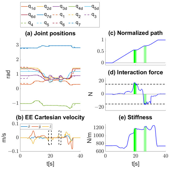 Data recorded during peg-in-hole experiment insertion and extraction phases: (a) joint positions; (b) EE Cartesian velocity; (c) normalized path; (d) interaction force; and (e) stiffness. Black dashed squares and green surfaces in plots (c–e) indicate time intervals when optimization is activated.