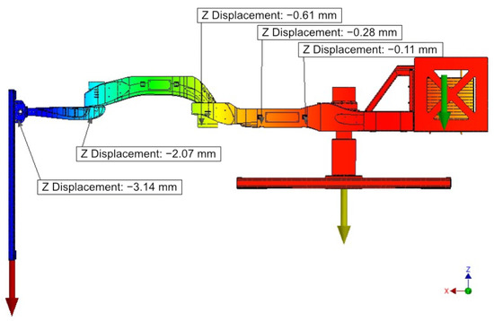 Table 7 shows, the absolute values of the differences between vertical displacements from the simulation and the results from photogrammetry in the “I” position were in a range of hundredths of millimetres. The maximum difference was an absolute value of 0.08 mm. This finding suggests that with an adequate approach, the displacement simulation on this type of robotic arm can achieve results that are relatively consistent with real values. This concordance also indicates that the expected tolerances were fairly precisely observed in the manufacture and assembly of the robotic arm.
