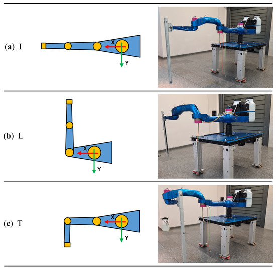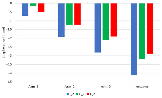 Figure 11 shows a comprehensive analysis of the displacement of individual arms when the end actuator is loaded with 35 kg in the “I” position. Positions “L” and “T” were evaluated in the same way. The maximum displacement values of all four monitored components (arm 1–3 and actuator) for all three monitored arm configurations are shown in
