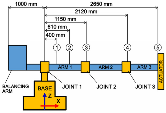 Table 1. First, we cleaned the measured point, then we placed the deflection meter stand in the corresponding position in the unloaded state of the arm. The stand was attached to the upper horizontal surface of the robotic arm base. The stem of the deflection meter always rested perpendicular to the horizontal surface on the robotic arm, so the results provided and listed are always relative to this horizontal surface of the base. We clamped the deflection meter in the stand and set the rotary dial to zero. Then, we loaded the end effector with a load of 35 kg and read the measured value of the vertical displacement from the meter. After this, we unloaded the arm and read the deflection meter again to verify that the arm was returning to its initial position. This is how we measured the values of vertical displacement at the five measurement points in position “I”.