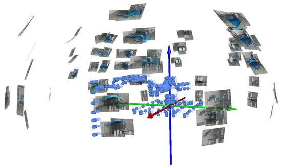 Figure 5. Taking into account the size of the robotic arm, the size of the calibration bars used, the diameter of the reference points, the range of the flash, the required resolution and the spatial layout, an approximate imaging distance of 3 m was chosen (the lens was manually focused at this distance). First, four calibration pictures were taken (from one position, turning the camera by 90°), and then about 20 pictures were taken from each of the five height levels, i.e., a total of at least 100 images for each measurement series (