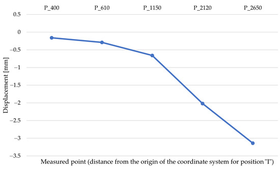 Table 3. The vertical displacement at the first measurement point, which was located at the shortest measured distance of 400 mm from the central axis of the arm, was −0.16 mm. Conversely, at the farthest measurement point from the central axis, i.e., at a distance of 2650 mm, the vertical displacement was −3.14 mm. The measurement checked whether there was any permanent deformation of the arm.