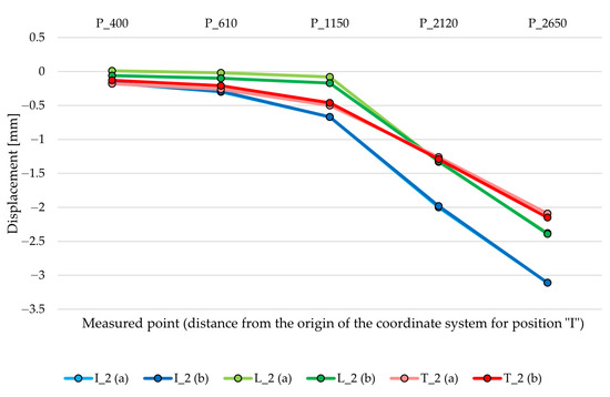 Table 4. It is evident that the displacement vectors of each pair of points coincide with the “I” position in each of the examined locations, with a maximum difference of 0.02 mm. Arithmetic means of the two values were also taken as reference values for verification with manual measurement for each evaluated location. For completeness,