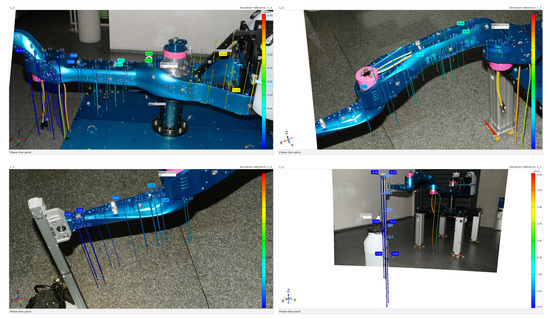 18]) based on the set of 2D photographs taken. If we take a series of images in individual positions of the arm in a loaded and unloaded state, then we can monitor the displacement (deformation) of the reference points when the arrangement of the arms is changed, or after the end effector of the robotic arm is loaded.
