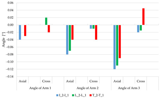For example, it is evident in the “I” arm position (blue bars) that as the number of joints and the total length of the arm chain increases, so does the longitudinal rotation (tilt). In arm 1, it is −0.04 mm, whereas in arm 3, it is −0.12 mm. This angle naturally includes the deformation of the third, second and first joints and any deformations of these arms. The average rotation from each segment in this case is −0.04 mm (also verified by an analysis of the relative deformations and tilts of the arms), and it also shows that the stiffness of the joints (motors) and individual arms is uniform with regard to the stress in the given place. It should be noted that an angle change of 0.05° over a length of 2.5 m is a displacement of 2.2 mm. The angular changes therefore only confirm the displacements found in the previous analysis.