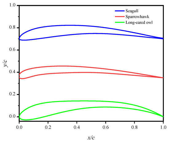 The aerodynamic performance of the wings of a seagull, long-eared owl, and sparrowhawk with a wing shape along 40% of the spreading cross-section is excellent, and the lift–drag ratio is large. Therefore, seagulls, long-eared owls, and sparrowhawks with different flight characteristics were selected as bionic objects in this study. As illustrated in Figure 1, the initial airfoils were realized by modeling the wing shape along 40% of the spreading cross-section of the three bird species.