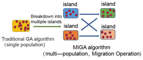 The multi-island genetic algorithm (MIGA) is an improved parallel distributed GA proposed by Miura et al. [25]. The GA does not use external information for evolutionary search but uses a fitness function to search for superiority within a population. As illustrated in Figure 4, the MIGA divides the population into several isolated and independently evolving subpopulations on different islands. The populations in the islands are migrated, and information is exchanged to maintain population diversity and suppress premature maturation. As a pseudo-parallel genetic algorithm, the MIGA is highly effective for determining the optimal global solution for a sample. Compared with conventional GA, MIGA has better global solving ability and higher computational efficiency. Therefore, we used a MIGA for optimization.
