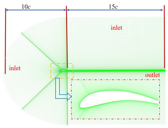 Considering the lower airfoil point of the trailing edge of the seagull airfoil shape as the origin, the distance between the upper and lower sides was set to 10 times the chord length, and the distance between the front and the back was set to 15 times the chord length, as displayed in Figure 6. In front of the airfoil, the upper and lower boundaries were the velocity inlet boundary, the back of the airfoil was set as the pressure outlet boundary, and the airfoil was set as the no-slip wall surface. The velocity inlet boundary of the water flow was 1.5 m/s, and the incoming flow was incompressible. A standard two-equation model was used as the turbulence model [29,30]. Pressure was obtained using a SIMPLE algorithm and momentum discrete term solution in the second-order windward format. After 800 computational iterations, the results converged, and the lift–drag coefficients of the airfoil did not change further.