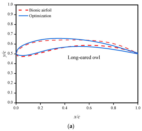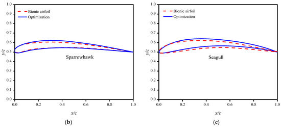 Bionic airfoil shapes before and after optimization. (a) Long-eared owl airfoil; (b) Sparrowhawk airfoil; (c) Seagull airfoil.