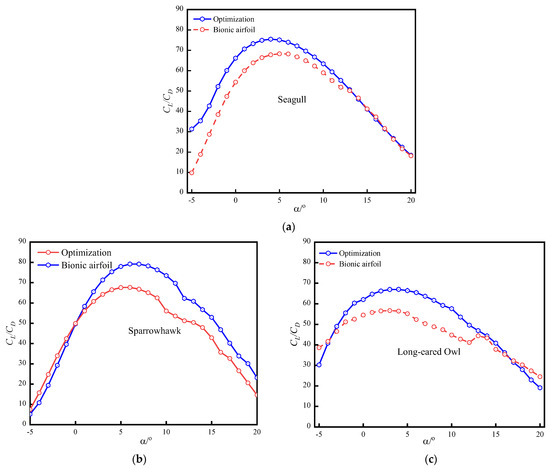 Comparison of lift−drag ratio coefficients before and after optimization of the bionic airfoil. (a) Seagull lift−to−drag factor; (b) Sparrowhawk lift−to−drag factor; (c) Long−eared owl lift−to−drag factor.