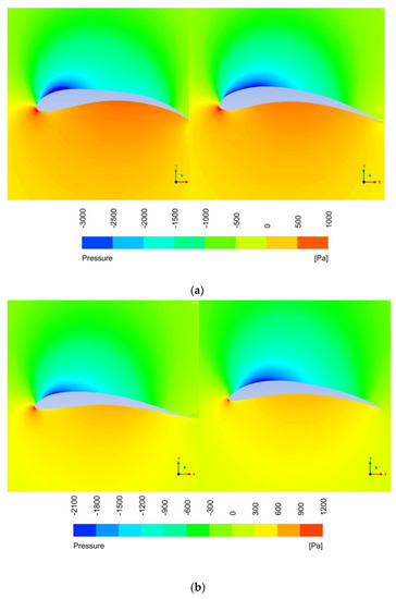 Figure 11, Figure 12, Figure 13 and Figure 14 illustrate the pressure and velocity cloud images of the initial and optimized airfoils of the long-eared owl, seagull, and sparrowhawk at the maximum lift–drag ratio. The optimized pressure clouds of the three bionic airfoils indicated that the top wing surface had a broader and more uniform negative pressure area. The negative pressure area of the initial airfoil was concentrated in the front area of the airfoil. By contrast, the negative pressure area of the optimized airfoil was concentrated in the front middle area of the airfoil. The more uniform distribution of the negative pressure area indicated better stability of the optimized airfoil structure. According to the velocity flow line diagram of optimization, the area of the negative pressure zone of the airfoil increased, thereby increasing the flow velocity of the upper surface, indicating that the actual working process of the turbine blade efficiency increased. Furthermore, the velocity flow diagram of the long-eared owl at the initial wing angle of attack of 5° indicated that the vortex was generated at the trailing edge of its airfoil and became more noticeable at an angle of attack of 10°. The generation of the vortex and increase in its size considerably reduced the lift coefficient of the airfoil. The sparrowhawk’s airfoil exhibited higher stability, and no vortex was generated before and after optimization within the range 0–10°; this is consistent with previous reports [9]. For the seagull airfoil, almost no vortex was generated at the rear edge of the initial wing at an angle of attack of 10°, and after optimization at an angle of attack of about 10°, no vortex was generated at the trailing edge of the airfoil. The optimized pressure cloud diagram and velocity flow line diagram of the long-eared owl and sparrowhawk airfoils indicated that when the camber and thickness of the airfoil increased, the relative maximum camber and maximum thickness shifted backward. In addition, the flow velocity of water on the top surface of the airfoil increased, and the suction force on the lower airfoil surface increased, thereby increasing the lift coefficient and lift–drag ratio coefficient.