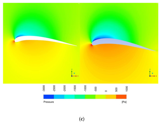 Three bionic airfoil pressure diagrams. (a) Comparison of pressure contour diagrams before and after optimization of the long−eared owl at an angle of attack of 5°; (b) Comparison of pressure contour diagrams before and after optimization of the seagull at an angle of attack of 4°; (c) Comparison of pressure contour diagrams of the sparrowhawk before and after optimization at an angle of attack of 6°.