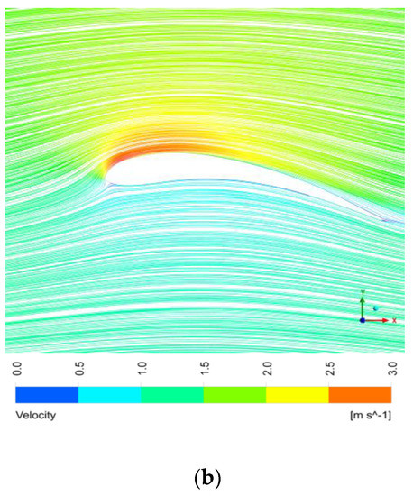 Streamline diagrams of the long−eared owl airfoil. (a) Streamline diagram of the initial airfoil velocity of the long−eared owl airfoil (angle of attack 5° on the left, 10° on the right); (b) Streamline diagram of the optimized airfoil velocity of the long−eared owl airfoil (angle of attack 10°).