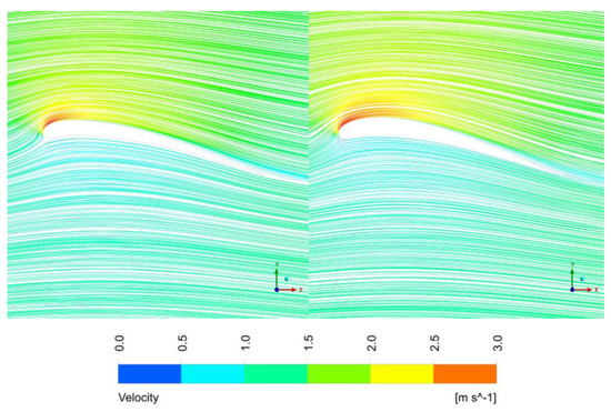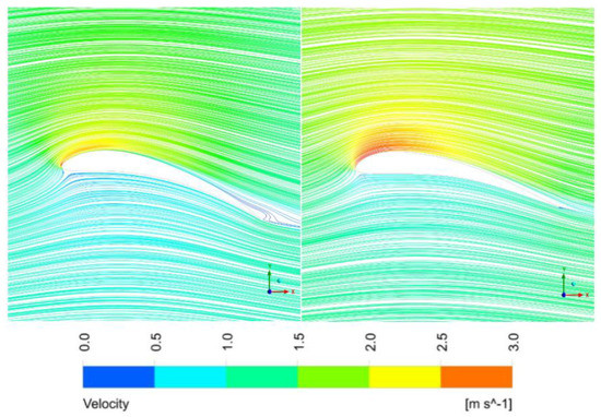 Streamline diagram of the optimized airfoil velocity of the seagull airfoil at an angle of attack of 10°. (Initial airfoil on the left, optimised airfoil on the right).