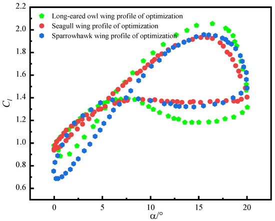 Table 4 lists the maximum lift coefficients of the three bionic airfoils at an angle of attack of 15°. The initial airfoil with the smallest lift coefficient at the angle of attack 15° was the sparrowhawk airfoil, and the one with the largest lift coefficient was the long-eared owl airfoil. After optimization, the long-eared owl wing type had the largest lift coefficient. However, based on the comparison of the lifting ratios, the seagull airfoil had the best optimization effect (7.86%) under the same optimization objective and constraints. The long-eared owl airfoil had the worst optimized maximum lift coefficient of 3.4%.