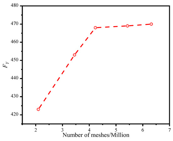 The basic settings of CFD numerical simulation were as follows: the atmospheric pressure was set as the reference pressure; the velocity inlet, having a uniform incoming flow with velocity U (1.5 m/s), was set as the input boundary; the pressure outlet was set as the outlet boundary, and the outlet relative pressure was set to 0; the side of the computational domain was set as the free sliding wall, and the turbine surface was set as the stationary wall. To verify the accuracy of the mesh model, a mesh-independent verification was performed, as illustrated in Figure 18. The third mesh was selected to reduce computational requirements. To compare the performance of the optimized seagull profile applied to the tidal turbine, the expressions of energy utilization and axial load factor were calculated as follows: