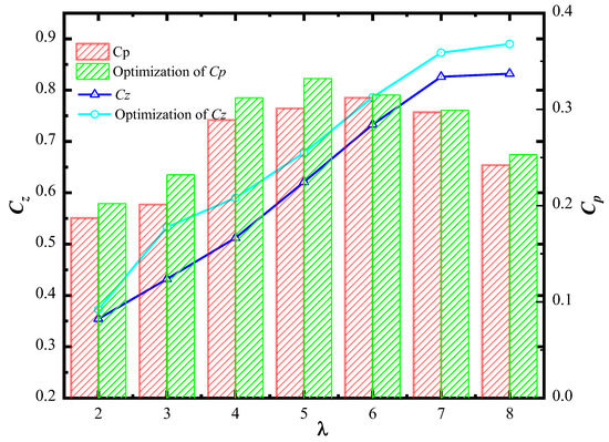 As illustrated in Figure 19, the optimized turbine coefficients CP and CZ in CFD validation at different tip speed ratios were more significant than those of the pre-optimized turbine. The values of CP and CZ were optimal at λ = 3 and worse at λ = 6. For λ = 2~8, the CP coefficient increased by an average of 8.42%. Thus, the optimized seagull wing type can increase the energy gain of the tidal turbine.
