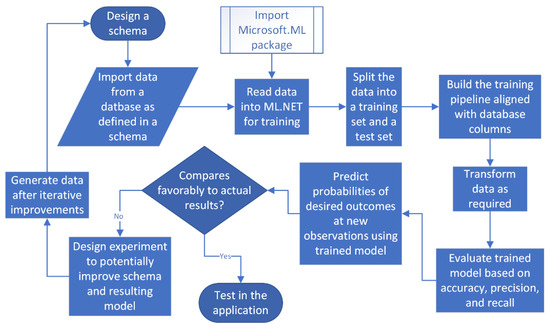The flowchart in Figure 2 shows the functionality of the software as it was developed in the ML.NET architecture consistently with a prepackaged program [33]. Figure 2 shows how the design of an appropriate schema is a key foundation for the objectives of this study. The following subsection proposes a schema design to obtain the most suitable data for the general case.