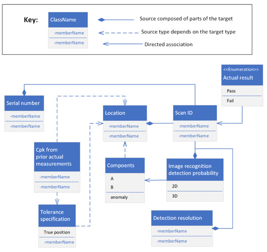 It follows from Figure 2 that a schema is needed to execute such an application. The schema in Figure 3 is designed to produce a database or spreadsheet organized accordingly. Next, the design of details in the schematic of the UML diagram in Figure 3 should be explained in terms of the concepts that have been previously described. UML diagrams show relationships between classes in some form of a relational database into which data from image recognition systems can be integrated within an architecture such as Unity. Each serial number will have its own file instance of inspection records. Thus, each scan ID becomes a new record, or row, in the database of its serial number. In addition to the serial number, each scan ID is also composed of the location observed in the assembly, the 2D and 3D image recognition probabilities, and the resolution of 3D image recognition at that location. When 3D recognition probability is high and resolution is sharp relative to the tolerance band, the image recognition can be expected to be more likely to predict the correct result. All that information is generated at each image recognition scan and can be executed as a semiautonomous procedure.