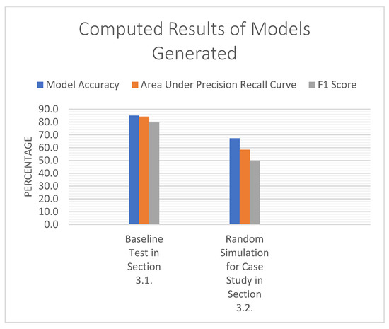 Due to the number of small faces on the brackets, the detectability of the brackets with 3D point clouds may not be reliably predictable. The continuous surface of the cables might be recognized far more frequently. However, if a Cpk value is high, the 3D object recognition of bracket position may often not be necessary for quality assurance, especially if the mounted cable can be recognized and measured to some extent. In such cases with a high Cpk value, the value in the first column may be far more important to determine whether anything unusual might have occurred based on what is recognized, as is reported in the second column. Other columns can be more significant when the 3D images are essential to assessments when the Cpk is lower. Once the Cpk is known, it is unlikely to change unless there is some type of process change to compel new measurements. All other values in the first five columns are usually available semi-autonomously from a computer-vision system. Notably, the results in the last column for this case were logically deduced based on the other values in each corresponding row to expedite some initial results. Data from an actual manufacturing operation were not yet generated for this initial illustrative study. Probably due to randomness of simulations, this test resulted in a model accuracy of 67.3%, an area under the precision–recall curve of 58.4%, and an F1 score of 50.0%. The last three rows in Table 2 below the solid line show the probability of the ability to correctly predict an in-tolerance condition in the last column based on values at the new observation points and the model trained from the dataset. The chart in Figure 5 shows the comparative results of the model tests reported here and in the prior subsection.