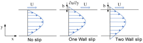 where and b are the slip velocity and slip length, respectively, μ is the dynamic viscosity of the fluid, and is the wall shear stress in the superhydrophobic channel.
