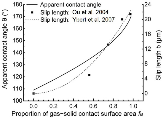 Relationship between apparent contact angle, slip length, and proportion of gas–solid contact surface area [30,31].