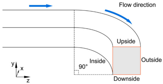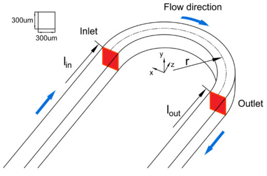 The dimensions of the U-shaped microchannel were a width, , of 300 μm and a depth, , of 300 μm, and the radius of curvature, , was varied as 0.5, 1.0, and 1.5 mm, respectively. Slip boundary conditions were applied around the wall. Both the inlet length, , and the outlet length, , were properly extended to ensure that the inlet flow was fully developed, avoiding conflict between the constant-pressure outlet boundary and the non-uniform flow.