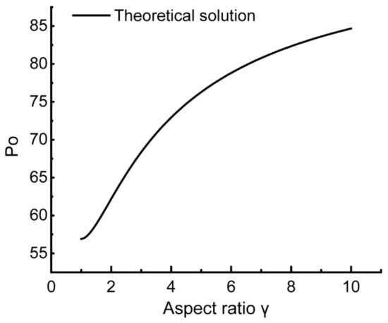 The laminar flow in a rectangular channel has been extensively studied [36,37]. After dimensionless transformation and integration of the infinite series, the variation of in the rectangular channel with different aspect ratios, , can be obtained according to Equation (15), as shown in Figure 5.