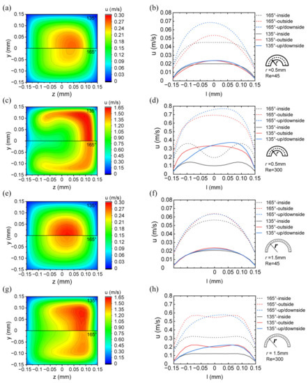Three-dimensional non-uniform slip velocity distribution: velocity magnitude distribution color map for r = 0.5 mm (a,c) and 1.5 mm (e,g) and Re = 45 (a,e) and 300 (c,g), and distribution of slip velocity around the middle section of the channel for r = 0.5 mm (b,d) and 1.5 mm (f,h) and Re = 45 (b,f) and 300 (d,h).