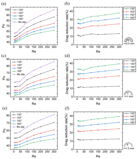 To illustrate the differences in fluid flows of superhydrophobic channels, a comparison of and the drag reduction rate, , as a function of Re and apparent contact angle is shown in Figure 10. We found that Po remained essentially constant when the flow rate was low, especially for a large radius of curvature. This is a reasonable result because the velocity field was almost the same as that of a straight channel, and the effect of the secondary flow can be ignored. With an increase in Re, the centrifugal effect of the flow became more significant, and Po rapidly grew. In this case, the maximum flow velocity region also shifted outward, which led to an increase in the slip velocity on the outside and a decrease on the inside of the microchannel. In fact, the overall drag reduction is an outcome of the balance between positive and negative effects. A superhydrophobic U-shaped channel still has a significant drag reduction, which becomes more obvious with an increase in the apparent contact angle.