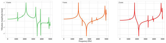 Having a modal analysis simulation that has been experimentally validated, it is possible to extrapolate its results in order to acquire more information regarding the dynamic behavior of the sensor-integrated vice in relation to its performance as a monitoring system for milling. The milling process is an intermitted cutting process, where the cutting forces are harmonic in nature. As such, it is possible to quantify the vibration amplitudes at the integration point of the sensor, sweeping all potential excitation frequencies, by using a harmonic analysis. Based on the modal analysis described previously, a harmonic analysis was set up in ANSYS software to investigate that aspect. The assumptions regarding the connections between the individual components of the vice and the mechanical restraints acting on the vice were the same as those of the modal analysis. The cutting forces that were used as input for the analysis were . These values were sourced from the available literature as typical values for roughing of hardened steel [25], which is expected to be the most difficult-to-cut material that will be used in this specific milling machine considering its overall capabilities. A frequency range of 0–5000 Hz was examined in steps of 100 Hz. The vibration amplitudes at the sensor-integration point are presented in Figure 5. It can be observed that the vibration magnitudes are in the sub-micron range for most parts of the frequency range (apart from the resonant frequencies of the system, which are not expected to be excited anyway due to the capabilities of the milling spindle). As such, no unwanted compliance will be introduced during the operation of the monitoring system, interfering with the vibration measurements.