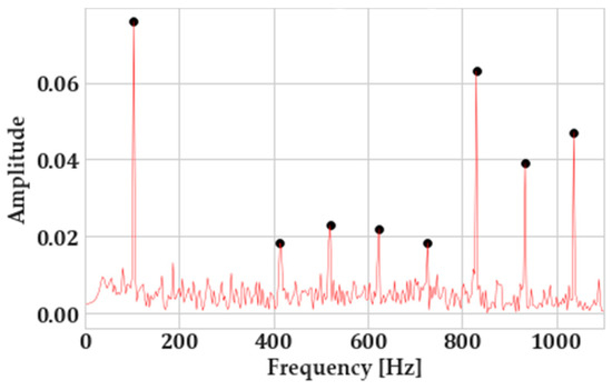 To tackle this and ensure correct initialization of center frequencies and thus the robustness of VMD to signal noise, peak picking is implemented in the fast Fourier-transform (FFT) of the vibration signals. For that, the “find_peaks” algorithm of SciPy (a highly popular package in Python for scientific computing) was utilized. The criterion that has been selected for the identification of a peak was its prominence, as it has been observed to be the most insensitive to the changes in the signal-to-noise ratio (SNR). The prominence of a peak explains how much it stands out due to its intrinsic height and its horizontal location with respect to other peaks. Figure 8 showcases the way peak picking is utilized on the FFTs of the vibration signals.