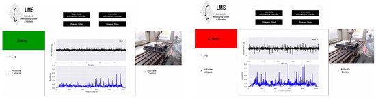 - The acceleration data, the fast Fourier-transform (FFT) of the data, and the chatter status were displayed in a user interface that was developed for this application. This user interface provides additional functionalities, such as start and stop of the stream, start and stop of communication with the machine controller, etc. The user interface is presented in Figure 9.