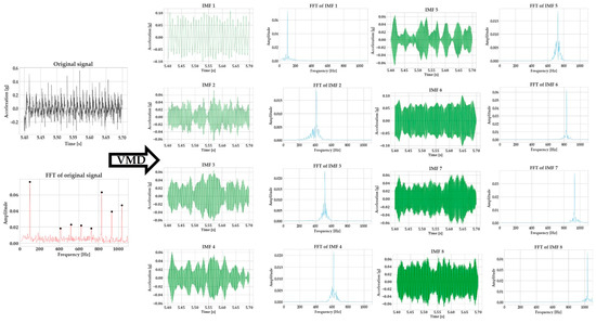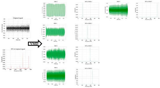 Variational mode decomposition (VMD) is an algorithm for signal demodulation developed by Dragomiretskiy and Zosso [27]. VMD is able to decompose a signal into its principal modes (). These modes are amplitude-modulated–frequency-modulated signals, which are compacted around a center frequency and have specific sparsity properties. The prior sparsity of each mode is its bandwidth in the spectral domain. The superimposition of these modes can recreate the original signal. VMD is a popular algorithm for signal processing in medical applications [28] and has found a use during the last years in the processing of signals generated by machining operations [29,30,31].