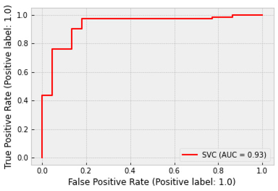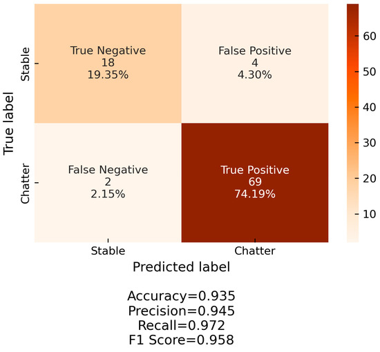 By applying the aforementioned methodology, it was possible to achieve a very high classification performance. Figure 12 and Figure 13 showcase the receiver operating curve (ROC) and the confusion matrix of the SVM classifier. A very high AUC score is observed. Additionally, it is very important that the false negatives (i.e., prediction of a stable process when the process chatters) are minimal. This ensures the robustness of the algorithm and the quick reaction to chatter onset.