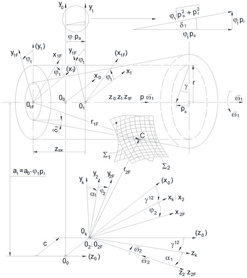 γ12 is −90°, taking into account the orientation of the axes. Our further analyses relate to the examination of rigid bodies. In this discussion, the worm gear hob created from the worm is labeled Σ