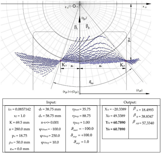 The parameters indicated in the input part of the table are the geometrical parameters of the worm gear drive, and the information on the movement and surface parameters. The output part of the table contains the coordinates of the meshing knotes KA and KB, as well as the value of the meshing opening angles βA and βB.