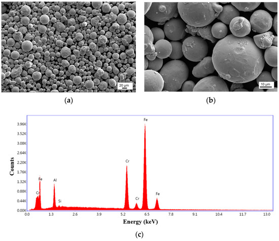 Gas-atomized Fe20Cr5.5AlY alloy powder with particle sizes ranging from 15 to 45 µm was procured from M/s Sandvik. The d10, d50, and d90 of the powder particles were 16.3 µm, 28.1 µm, and 48.4 µm, respectively. The powder has a spherical morphology with satellite particles as shown in Figure 1. The satellite particles are formed due to the faster solidification rates of smaller particles, which are adhered during atomization to the surface of the large particles. The chemical composition of the powder as provided by the supplier is given in Table 1. SS316L substrate is used as the base material for LDED-PF. Figure 1c presents the element spectrum of the powder obtained using energy dispersive spectroscopy (EDS) analysis. SS316L substrate is used as the base material for LDED-PF.