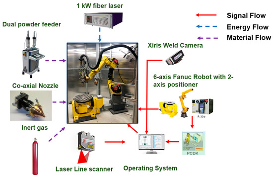 Figure 2 presents the schematic of the LDED-PF system developed in-house and used for the deposition. The system essentially consists of IPG photonics make 1 kW continuous wave fiber laser; GTV make dual hopper powder feeder; Fraunhofer make coaxial deposition. A 6-axis Fanuc robotic arm and a 2-axis positioner are used for motion planning during the LDED-PF process. An operating system developed in-house is deployed to control the robotic system and the auxiliary components. PROERA 3D, a CAD/CAM software developed in-house is used for the tool path generation. Argon gas at a flow rate of 10 L per minute is used as shielding gas and carrier gas. A laser spot diameter of 1.2 mm at the substrate surface is used for the deposition [24,25].