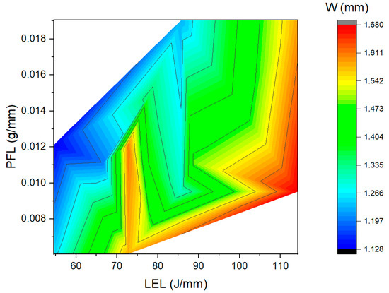 Track width (W) is a function of the LDED-PF process parameters. In order to understand the effect of LDED-PF process parameters on W, an experimental analysis is carried out using two combined parameters: laser energy per unit length (LEL) and powder feed per unit length (PFL). LEL is defined as the ratio between P and V (Equation (2)), while PFL is the ratio between F and V (Equation (3)) [19]. Figure 3 presents the effect of LEL and PFL on W.