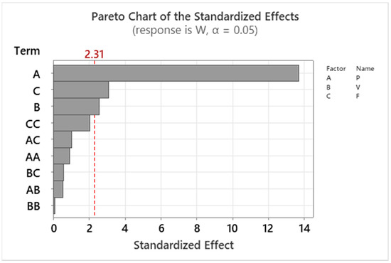 Pareto chart (significance level, α = 0.05) of the standardized effects of process parameters on W.