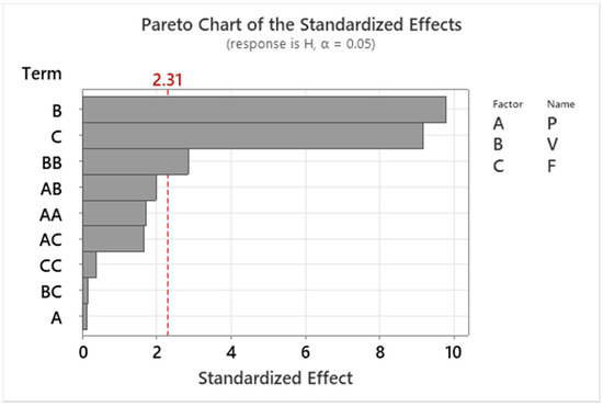 Pareto chart (significance level, α = 0.05) of the standardized effects of process parameters on H.