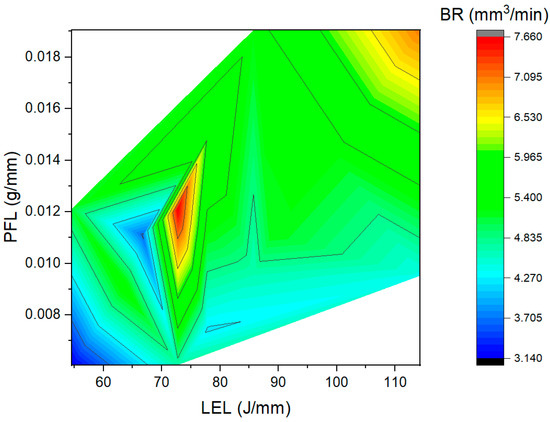 The build rate (BR) is defined as the product of the track area and V. As seen in Figure 7, the BR increases with an increase in LEL and PFL. This is mainly due to the increase in W and H with an increase in LEL and PFL due to an increase in the amount of energy and powder available for deposition, respectively. However, the effect of PFL is found to be more significant as compared to that of LEL. This is mainly due to the higher influence of F on the amount of material available for deposition or the track area. Further, V governs how fast the deposition head moves to add materials during LDED-PF. A lower V can increase the track area due to higher values of W and H, while it decreases the speed at which the deposition is happening. On the other hand, a higher V increases the deposition speed and reduces the track area. An increase in the BR at the central region of the plot (refer to Figure 7) can be due to the above-mentioned effect of V on the BR.