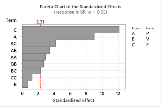 Pareto chart (significance level, α = 0.05) of the standardized effects of process parameters on BR.