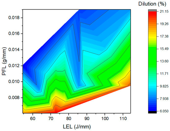 Dilution (DL) is defined as the percentage of depth of track (D) to the sum of depth and height as shown in Equation (7). It indicates the extent to which the substrate is melted during LDED-PF deposition. It is ideal to have dilution to a certain degree to have a good metallurgical bond between the deposit and substrate. However, a higher value of DL can result in an increase in the mixing zone and over-melting of the previous layer during multi-layer deposition. DL increases with an increase in LEL and a reduction in PFL as shown in Figure 9. The increase in DL with an increase in LEL is mainly due to the increase in the amount of energy available to melt the substrate. On the other hand, with an increase in PFL, the amount of material available for absorbing the laser energy increases and the amount of laser energy impinging on the substrate is reduced, which results in a reduction in DL.