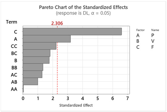 An ANOVA is performed to statistically examine the relative significance of the LDED-PF process parameters on DL as presented in Table 6. F is the most significant process parameter influencing DL, followed by P and V. The contributions of F and P towards DL are 56.9% and 13.2%, respectively. The Pareto chart presented in Figure 10 also shows that F is the most significant parameter in determining the DL of Fe20Cr5.5AlY deposits. The response model of DL is shown in Equation (8). The R2 of 0.89 indicates a good correlation between the experimental values and predicted values and the model’s significance is indicated by the p value < 0.05. It can be concluded that the model is significant with an 89.5% contribution towards explaining the behavior of DL.