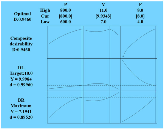 The multi-objective optimization approach is used to establish the optimum solution, which is the best possible combination of LDED-PF process parameters which meets two objectives to achieve a maximum build rate and target dilution of 10%. One of the approaches to solving a multi-objective optimization problem is the use of a desirability function, which converts the values of the estimated responses into a free scale. Generally, the value ranges from 0 to 1, in which 0 and 1 indicate the unsatisfactory level and the target or acceptable limit, respectively [30]. According to the desirability plot in Figure 11 and the resulting optimum setting of parameters shown in Table 7, the most desirable operating conditions are P = 800 W, V = 10 mm/s, and F = 8 g/min with the desirability value of 0.94. Table 8 presents the comparison between the predicted values and actual measured values, which shows good agreement. Therefore, the established prediction models can accurately predict the geometric characteristics of single tracks adequately.